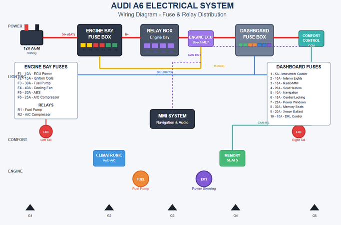 Audi A6 Wiring Diagram. Fuse and Relay box is a detailed guide to the electrical circuits of the Audi A6. It presents the location of fuses and relays, their purpose, as well as electrical circuits of the main systems: lighting, engine, climate control, multimedia, safety and comfort systems.